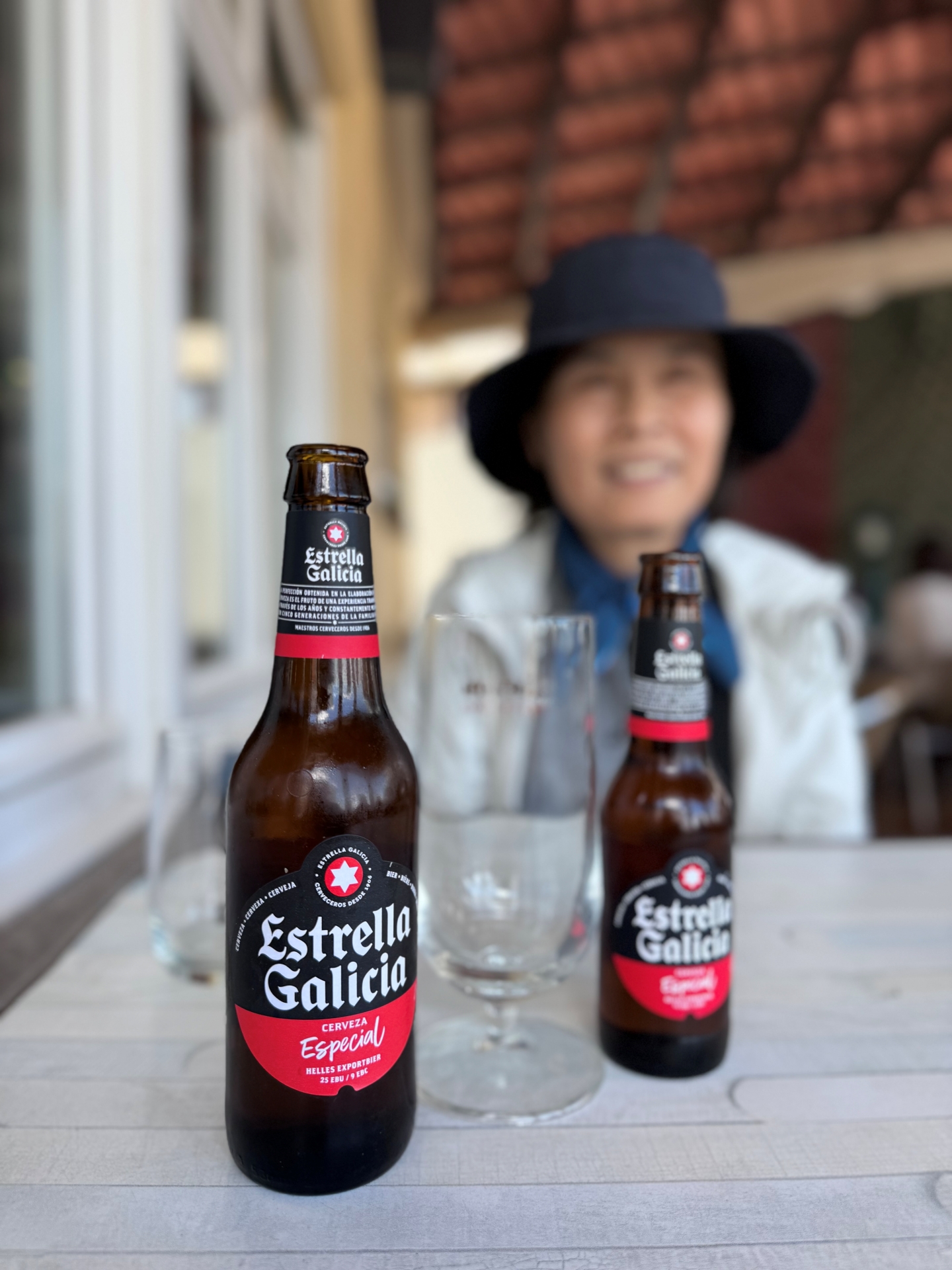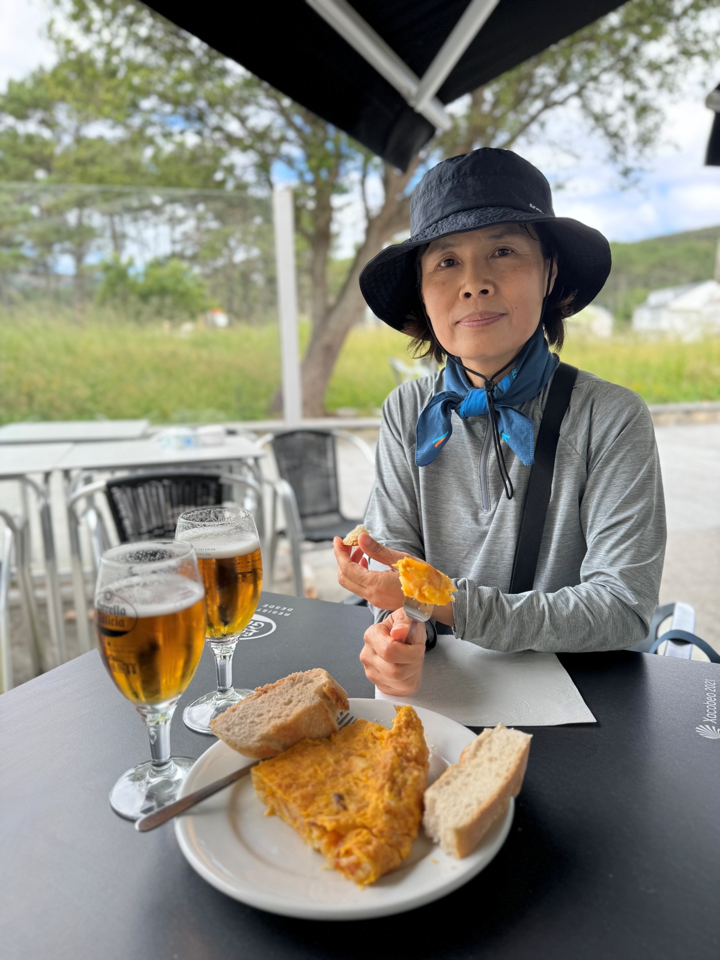 뒤따라온 남편과 숲길을 빠져나오며 만난 바다가 보이는 동네 빠에서 멈췄다. 성당에서 출발한 지 거의 한 시간쯤 지난 정오가 가까운 시간이다. 시원하게 맥주 한잔 마시고 가자하며 야외테이블에 자리를 잡고 앉아 또르띠야와 빵 한 조각 함께 주문해 먹었다.