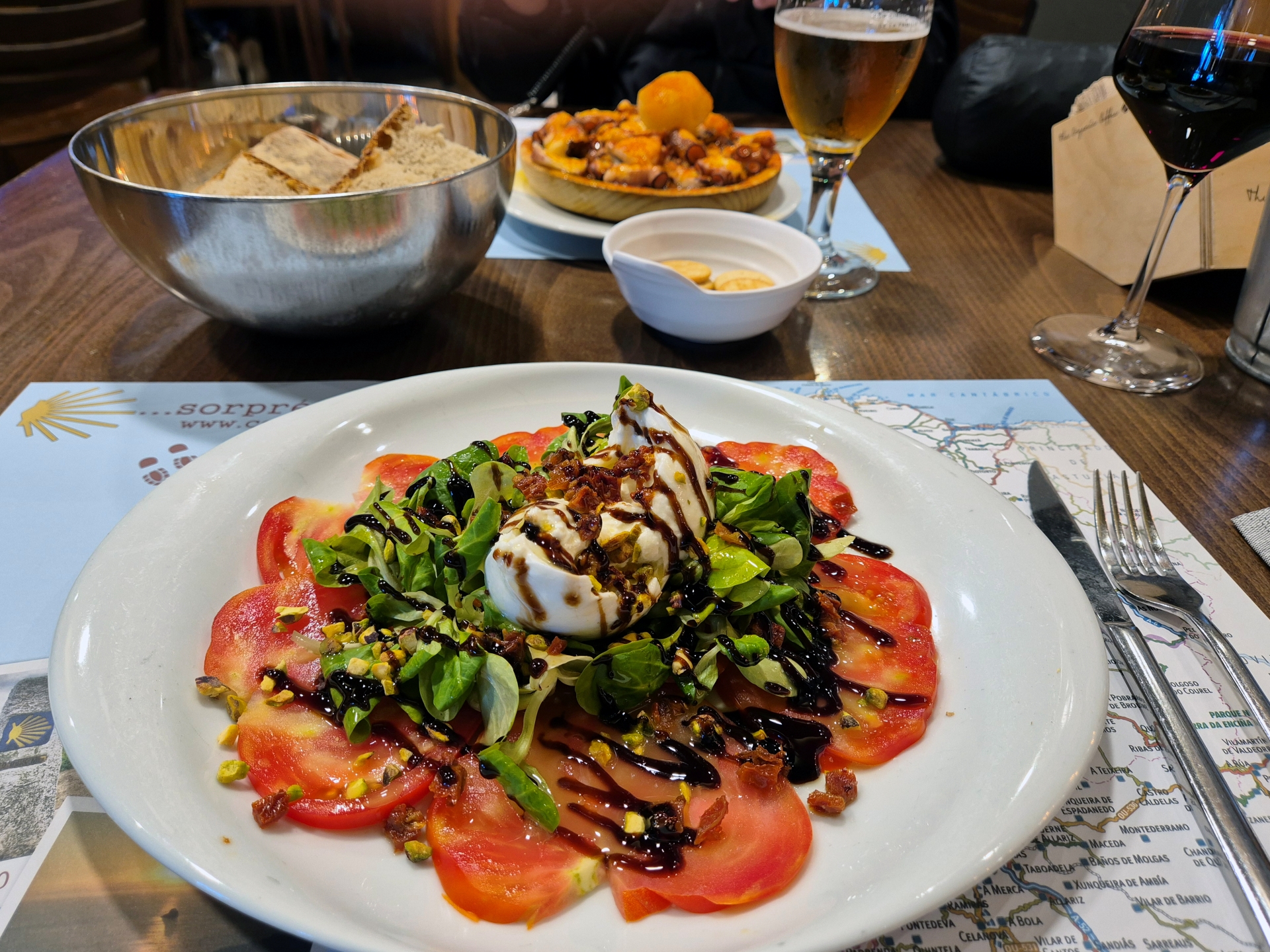우선 침대 옆에 배낭 놓고 나와 알베르게 앞에 있는 빠에 들어가 점심으로 바질 스파게티를 먹었다. 맥주 한잔씩 곁들여 먹는 식사는 꿀맛이었다. 식사를 하는 중 익숙한 얼굴들이 지나갔다. 길에서 만났던 청년들 무리도 우르르 지나간다.