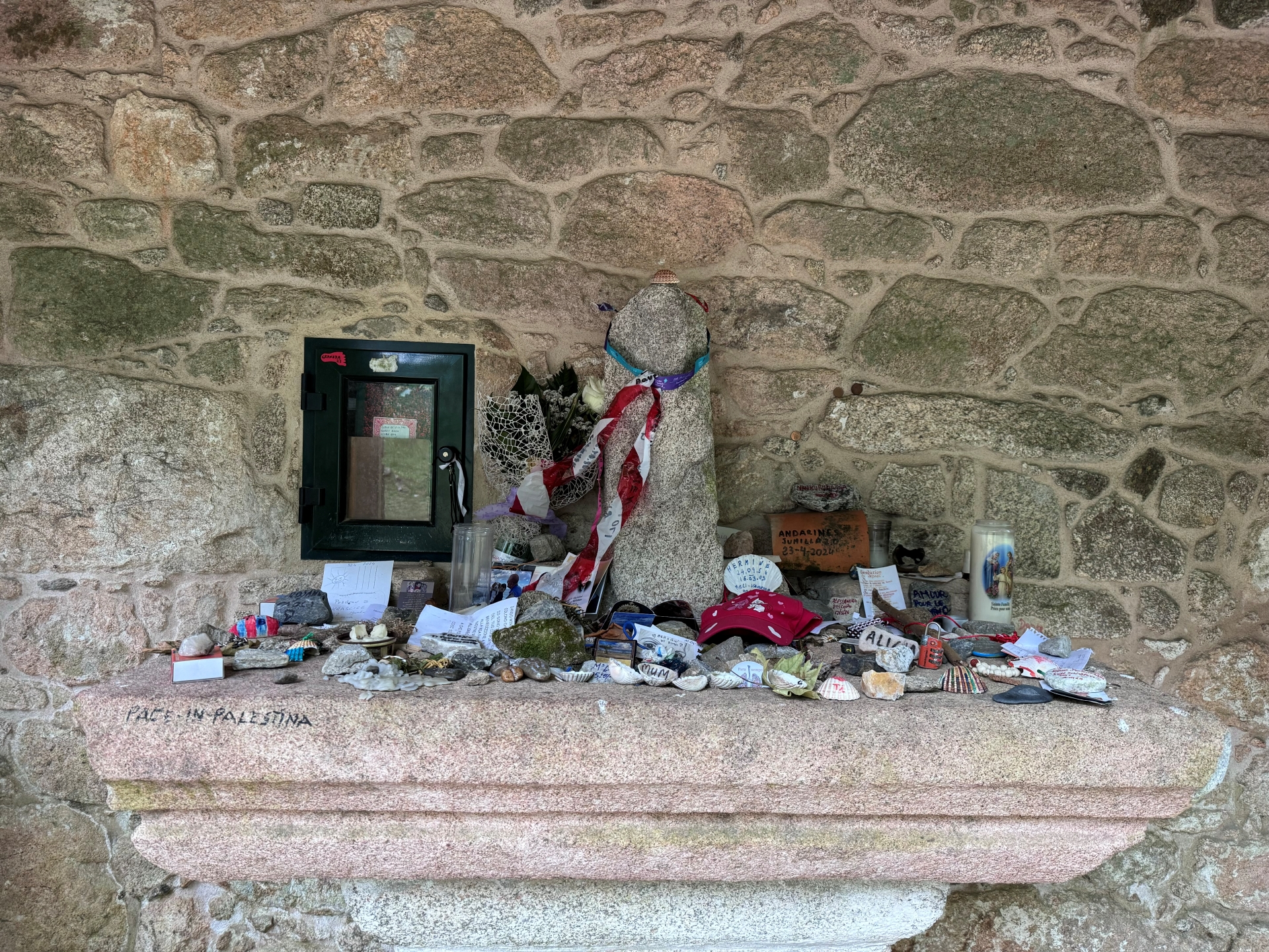 외딴곳에 있는 성당에서 잠깐 다리를 쉬었다. 누군가의 소원의 물증들이 올려져 있고, 흘리고 간 것인지, 끝이 보이는 길목에 일부러 놓고 간 것인지 모를, 아직 쓸만한 등산화가 나란히 놓여 있다.
